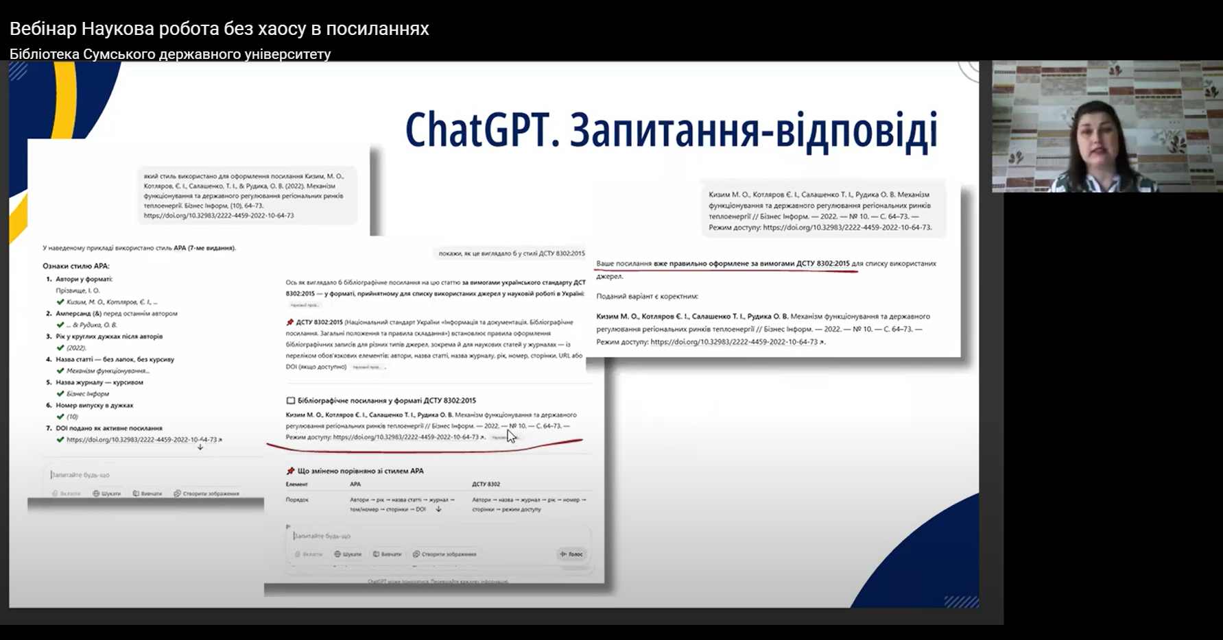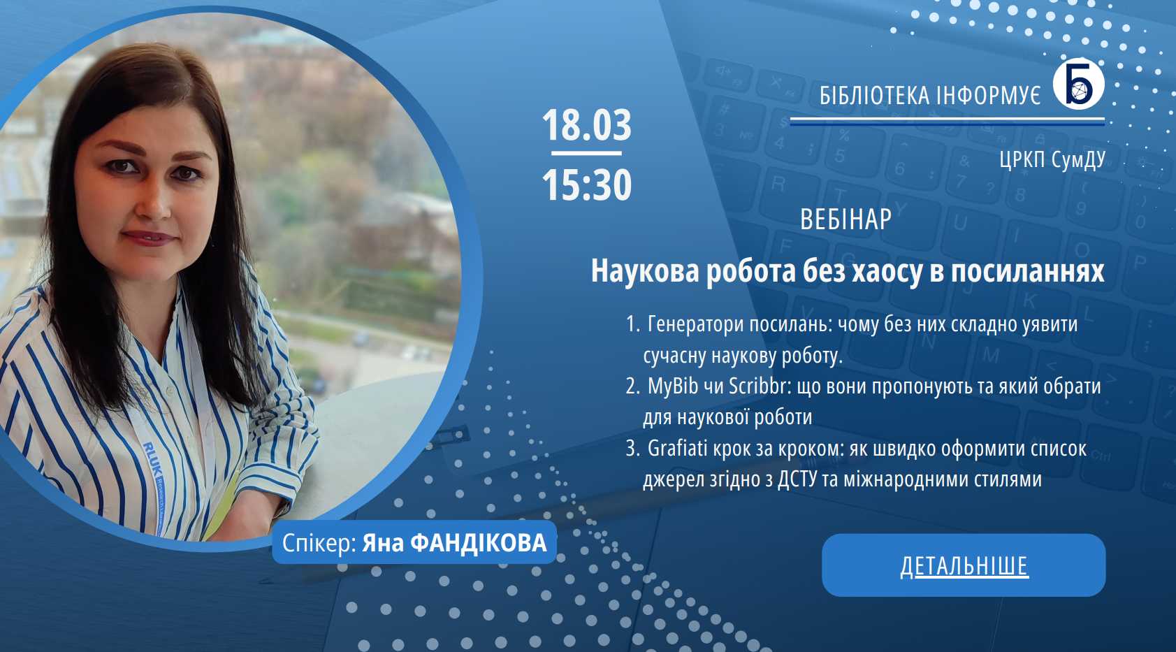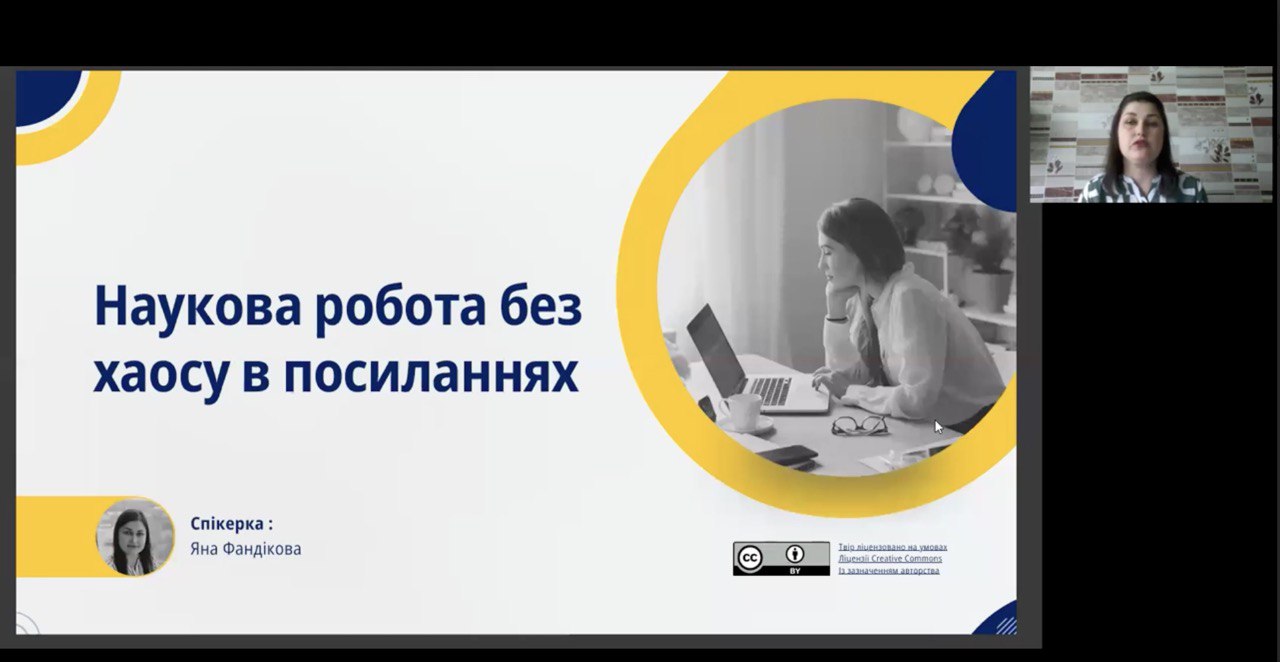 On March 18, a webinar "Scientific Work Without Chaos in References" was held, organized by the Library of the Central Research Center of Sumy State University. The speaker of the event was Yana Fandikova, who shared practical approaches to organizing sources in scientific works.
