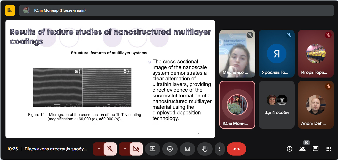 Під час захисту студенти продемонстрували високий рівень знань і глибоку обізнаність у тематиці своїх наукових досліджень. Вони вмотивовано і детально відповідали на поставлені запитання, показавши не тільки знання специфічних аспектів матеріалознавства, але й здатність аналізувати й обговорювати загальні питання в цій галузі. Така висококваліфікована підготовка дає впевненість у подальших наукових досягненнях наших випускників.