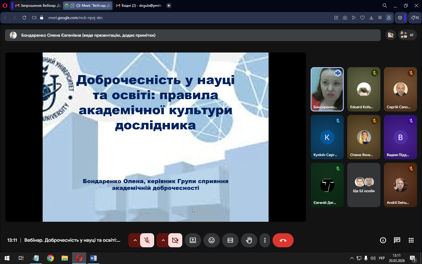 Запрошеною спікеркою заходу стала Бондаренко Олена Євгеніївна — керівниця групи сприяння академічній доброчесності СумДУ. Вона представила доповідь на тему «Доброчесність у науці та освіті: правила академічної культури дослідника». До участі у вебінарі долучилися студенти бакалаврського та магістерського рівнів, а також викладачі факультету.