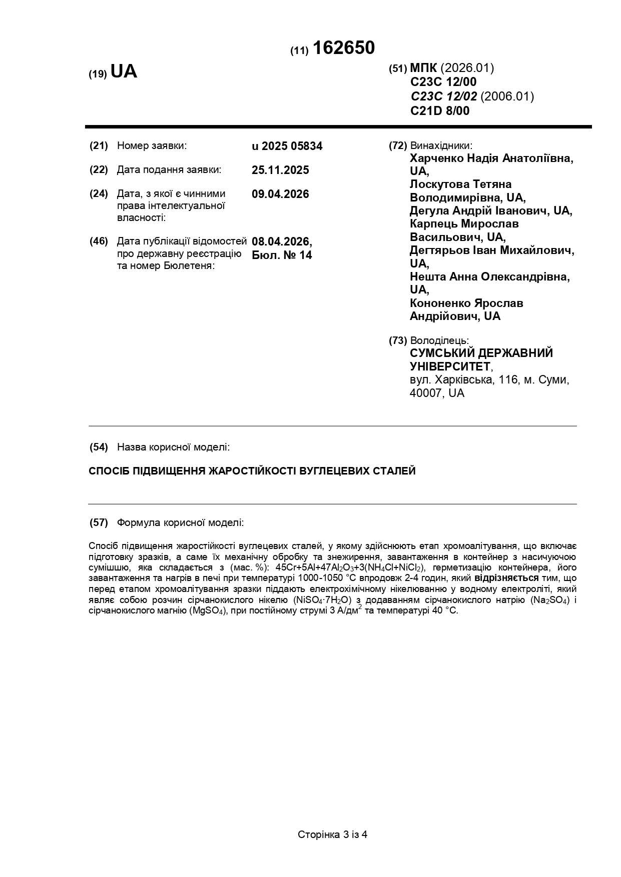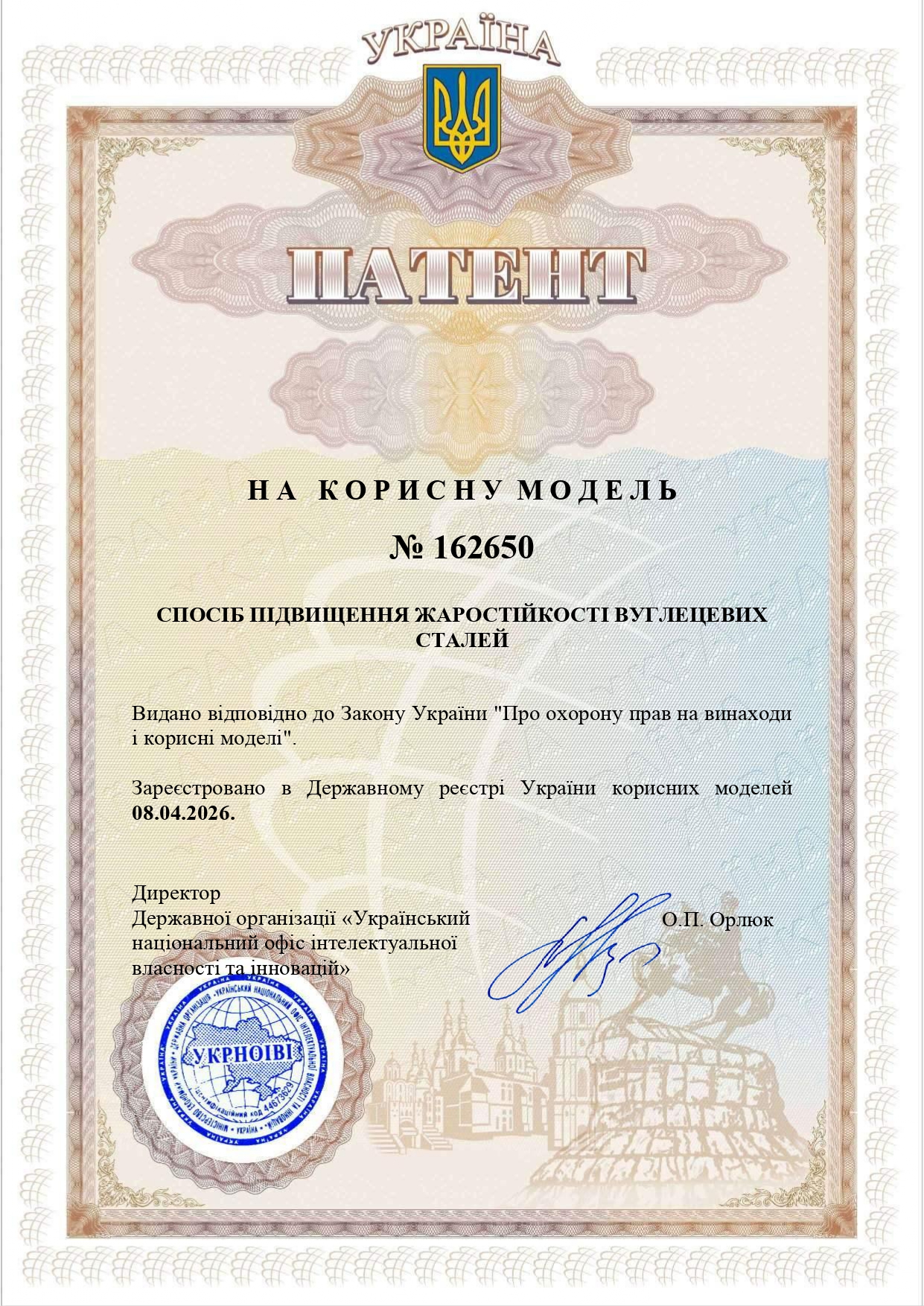 Колектив науковців Сумського державного університету отримав патент України на корисну модель №162650 «Спосіб підвищення жаростійкості вуглецевих сталей».