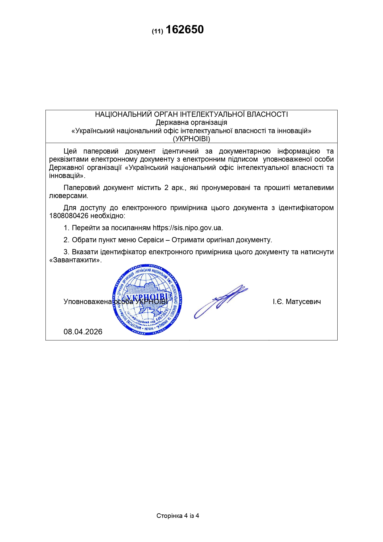 Відповідно до даних Український національний офіс інтелектуальної власності та інновацій, державну реєстрацію патенту здійснено 8 квітня 2026 року. Право інтелектуальної власності набуло чинності з 9 квітня 2026 року.