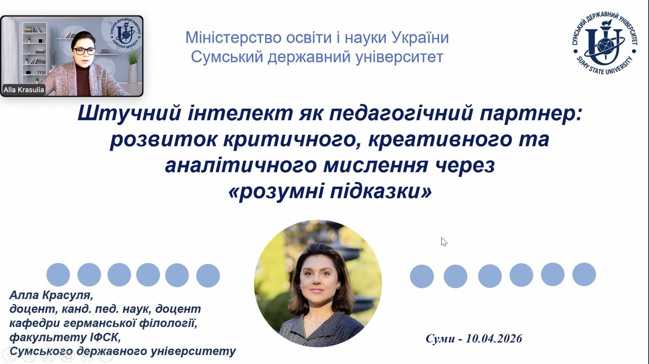 У період з 6 по 10 квітня 2026 року доцентка кафедри Надія Харченко взяла участь у програмі підвищення кваліфікації «Ефективне навчання: методи, що працюють», організованій Центр розвитку кадрового потенціалу Сумського державного університету.