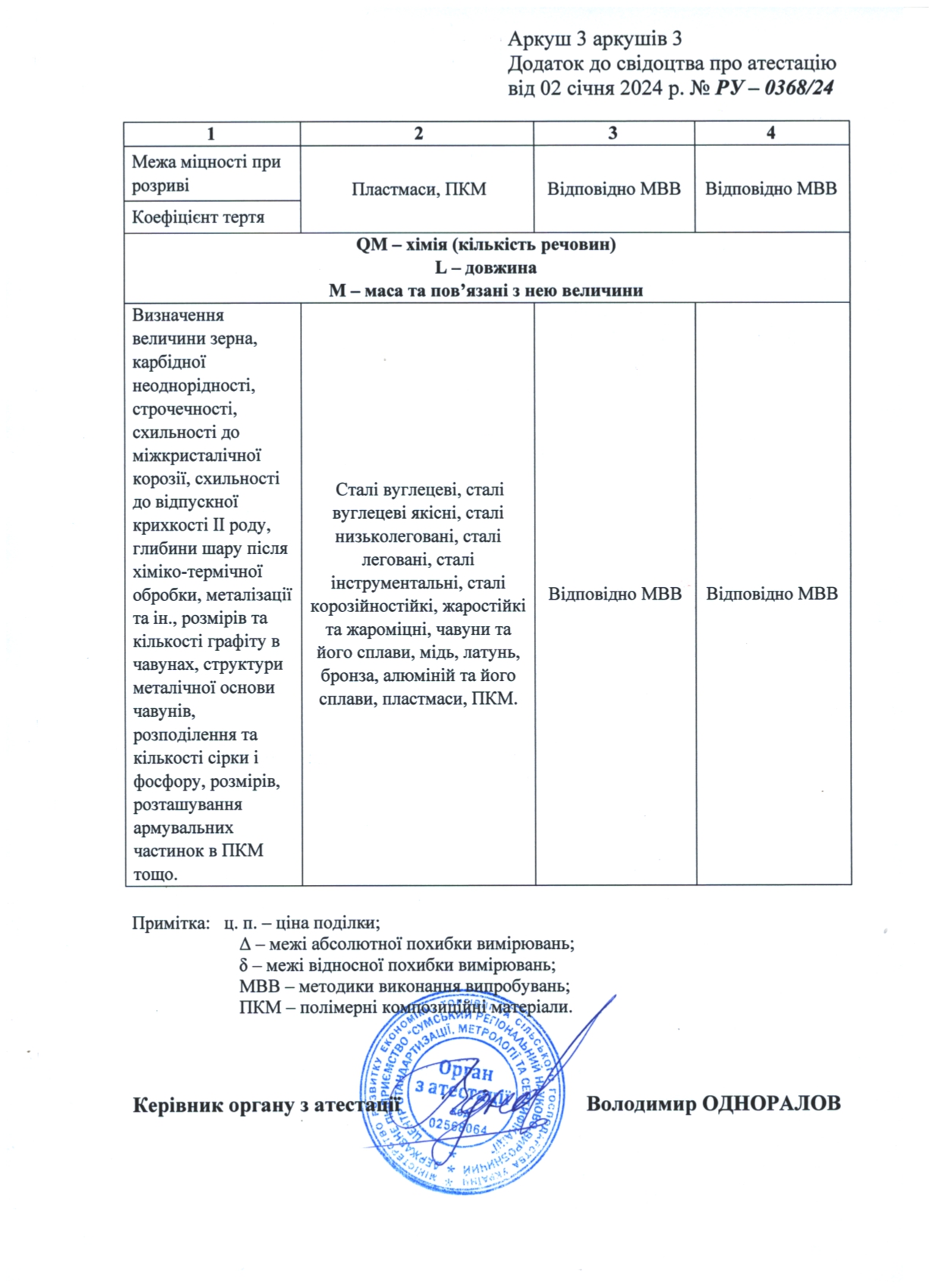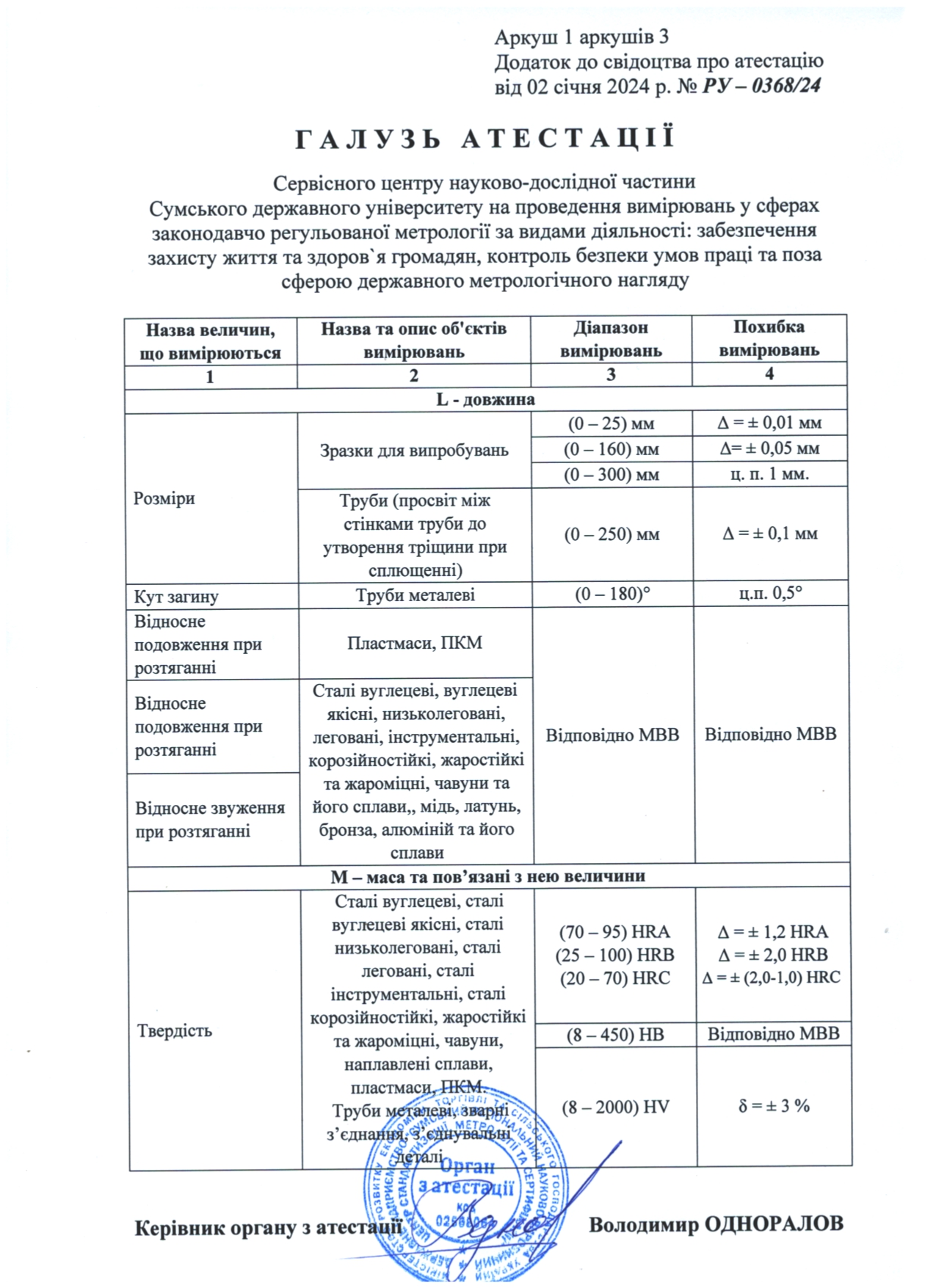 Науково-дослідна лабораторія прикладного матеріалознавства (свідоцтво про атестацію № РУ-0368/24 від 02.01.2024 р., видане органом з атестації ДП «Сумистандартметрологія», дійсне до 02.01.2029 р.), що функціонує на базі кафедри прикладного матеріалознавства і технології конструкційних матеріалів Сумського державного університету, надає широкий спектр послуг. Високу якість робіт забезпечують кваліфіковані фахівці та злагоджена робота досвідченого персоналу.